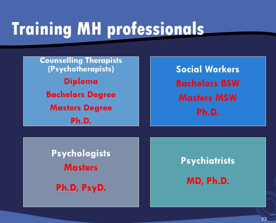 Many professionals are trained and qualified to provide professional psychotherapeutic services. These people are clinical counsellors, social workers, psychologists, and psychiatrists. Not all these people are trained and experienced in working with people with psychological injury.
